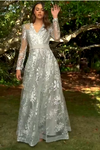 Vestido Manga Larga con decoraciones, estampado floral. Colores Smoky Blue y Silver