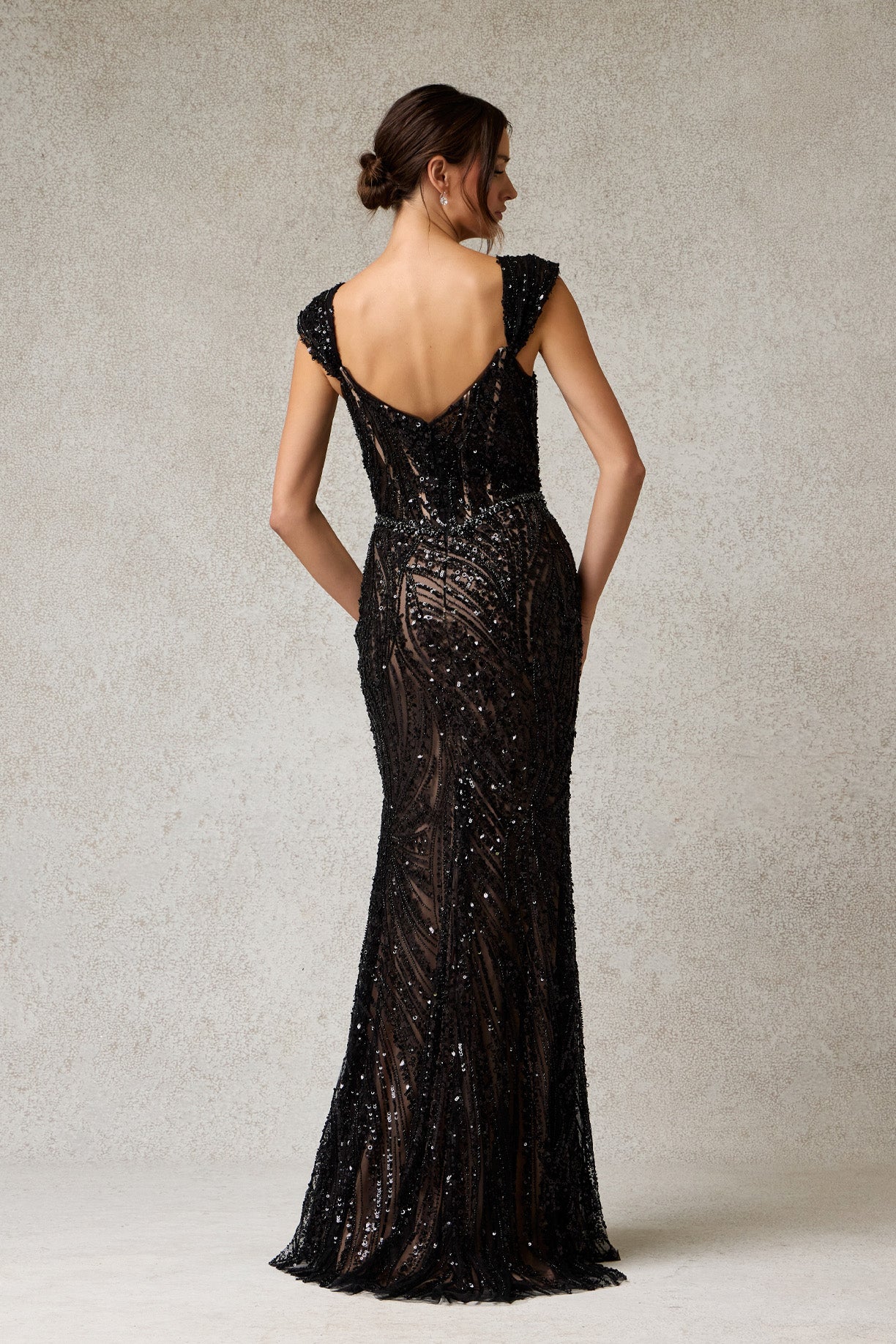 Vestido Recto de Tul con Tirantes Gruesos Ajustables, Bordado con Lentejuelas y Cristales, Colores Black Nude y Gold